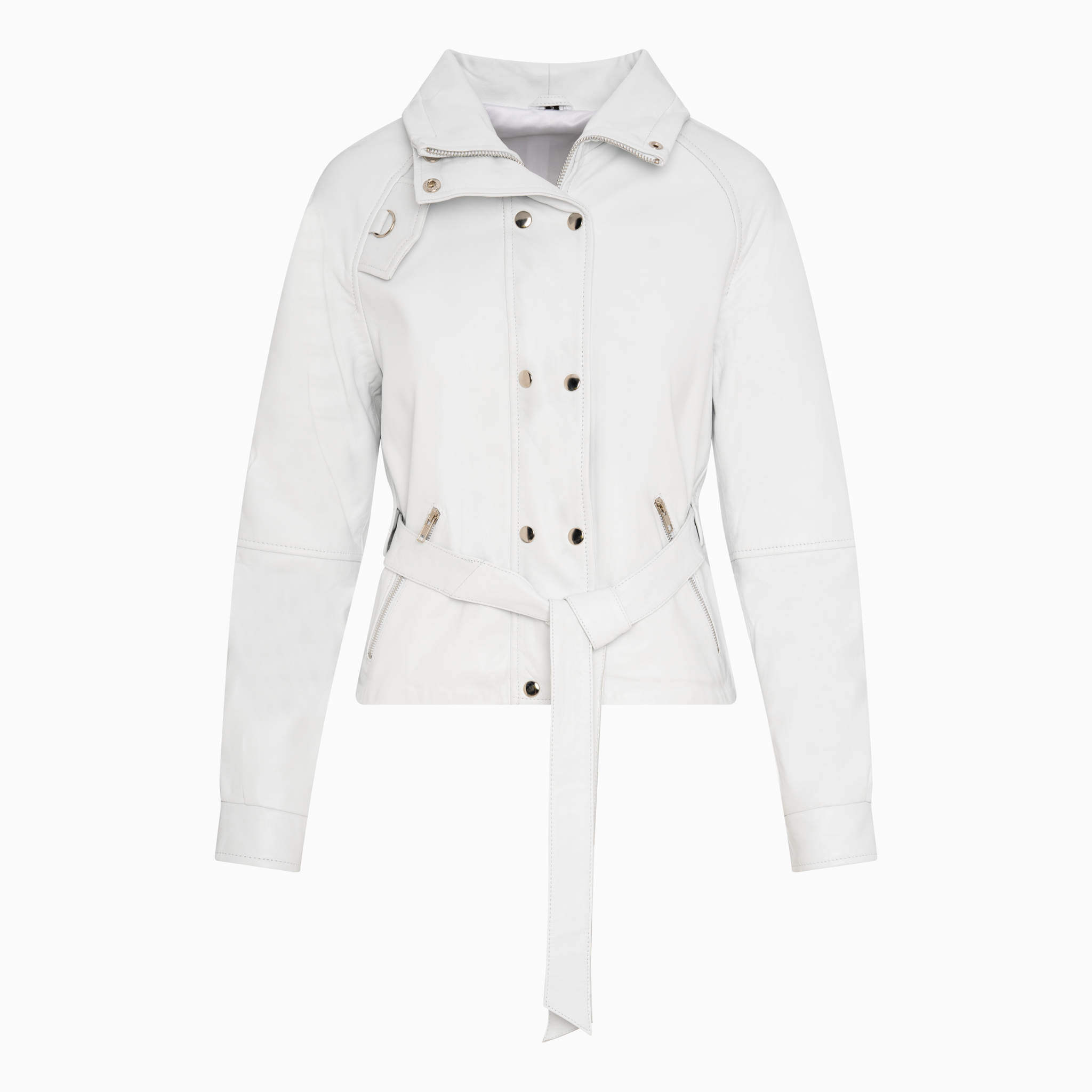 Model EMMA to damska kurtka skórzana w wyjątkowym białym kolorze, uszyta z półmatowej, miękkiej skóry naturalnej. Idealna na wiosnę i jesień, dodaje stylu każdej stylizacji. Skórzany pasek podkreśla kobiecą sylwetkę, a biały kolor pozwala wyróżnić się z tłumu i podkreślić indywidualny styl.