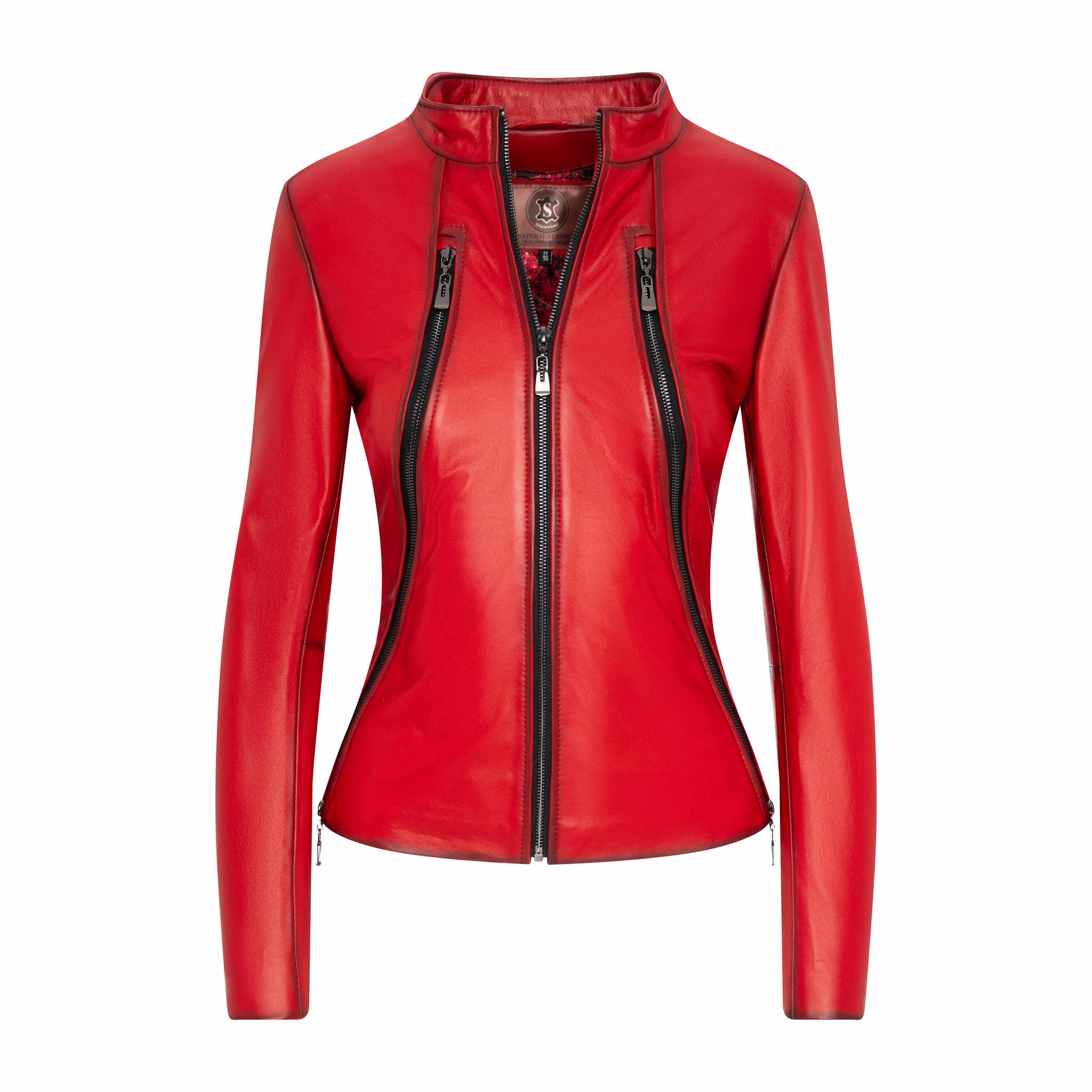 Czerwona Damska Kurtka Skórzana z zamkami – PATTI, która łączy w sobie elegancję i wyjątkowy styl. Wykonana z najwyższej jakości naturalnej skóry jagnięcej, zapewnia miękkość, lekkość oraz półmatowe wykończenie, co czyni ją idealnym wyborem na wiosnę, lato i jesień.