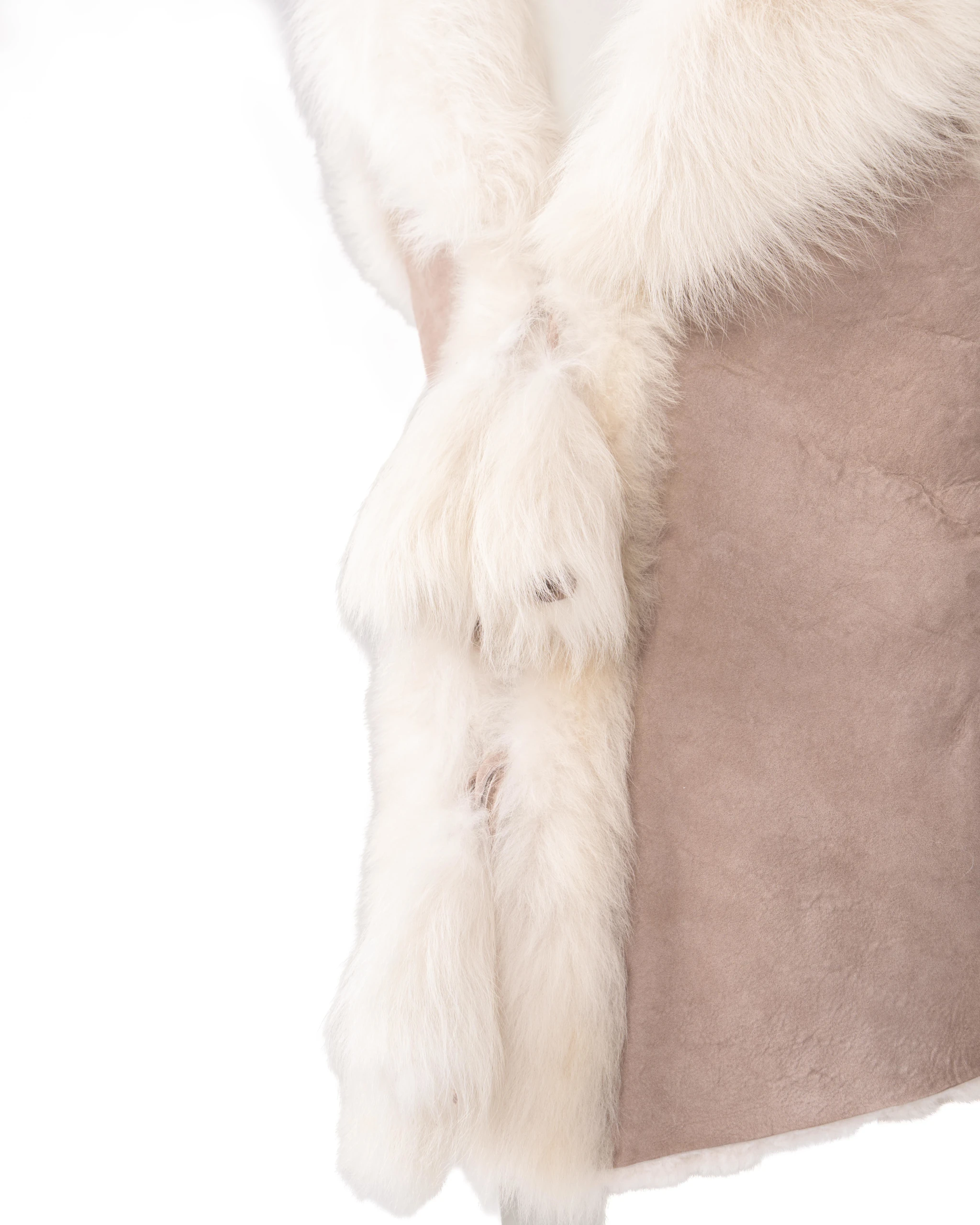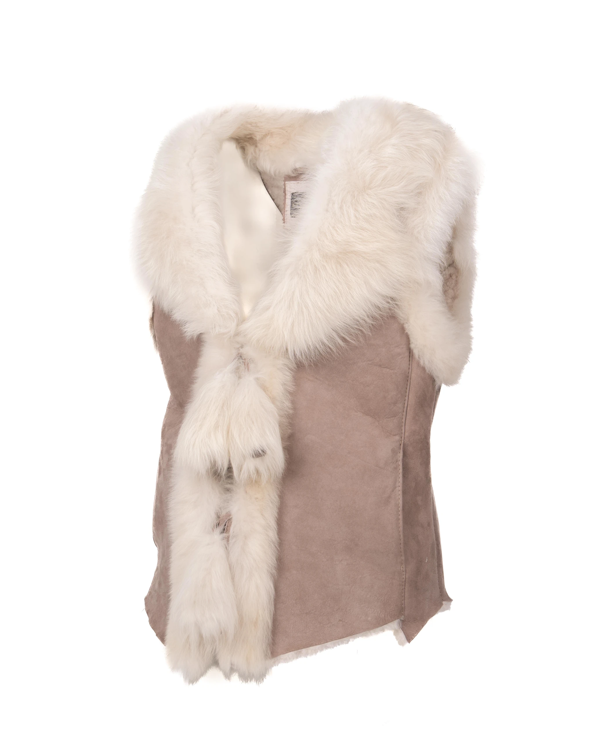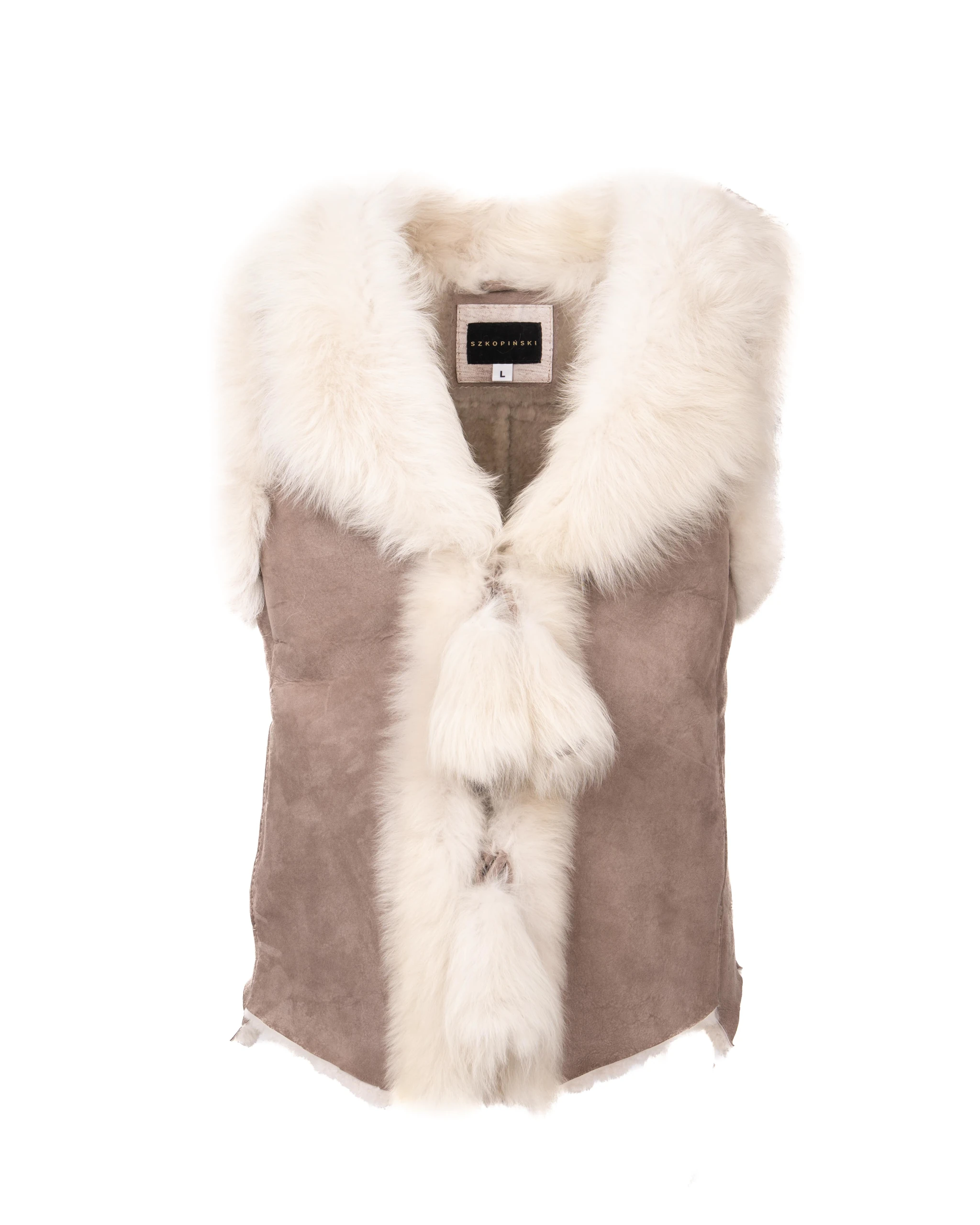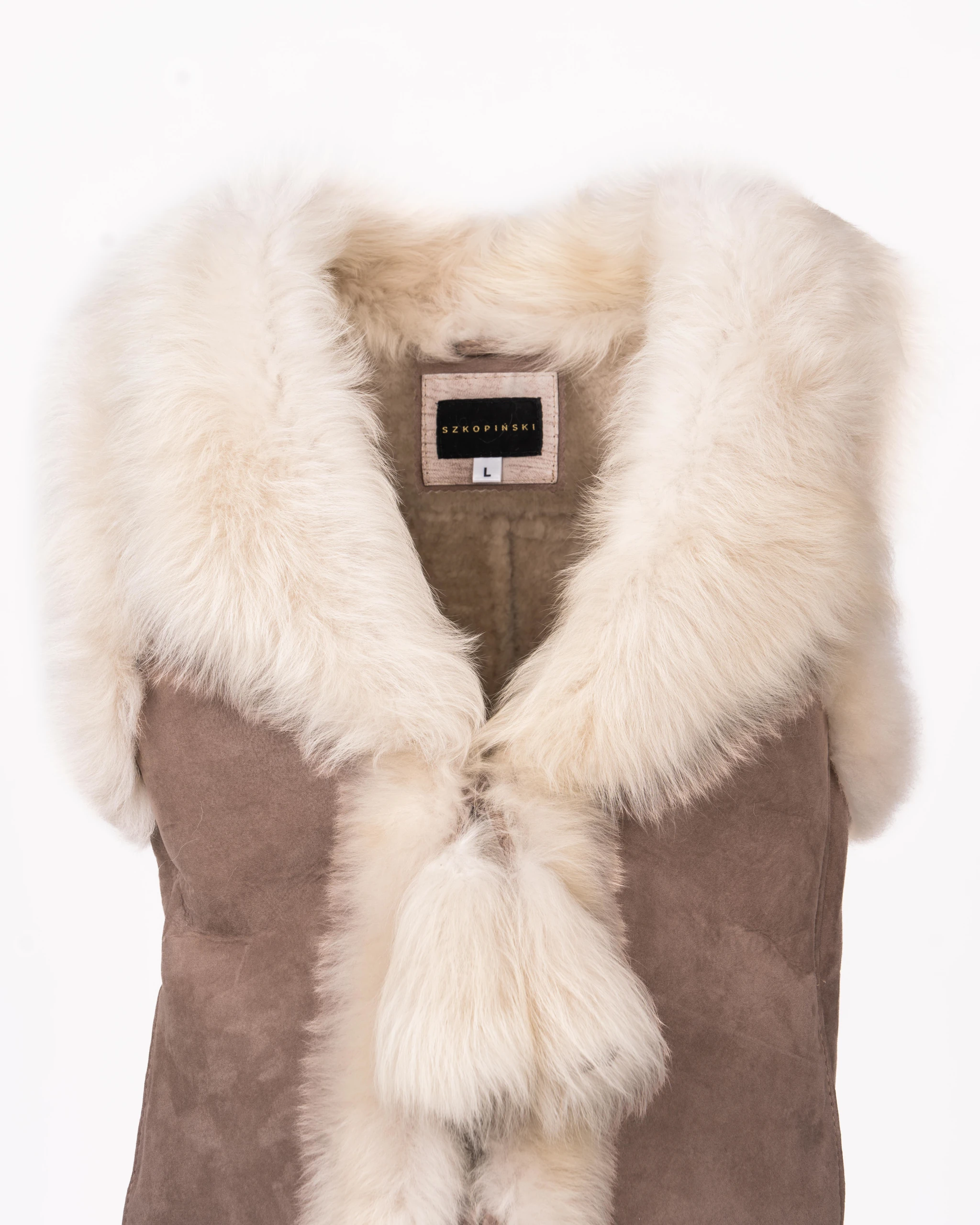 Wyjątkowym elementem kamizelki jest wykończenie z futra Toscana. To naturalne futro wyróżnia się długim, miękkim włosiem i subtelnym połyskiem, który nadaje całości eleganckiego wyglądu. Bogaty kołnierz oraz pionowe wykończenie z przodu tworzą efektowną linię, która optycznie wysmukla sylwetkę.