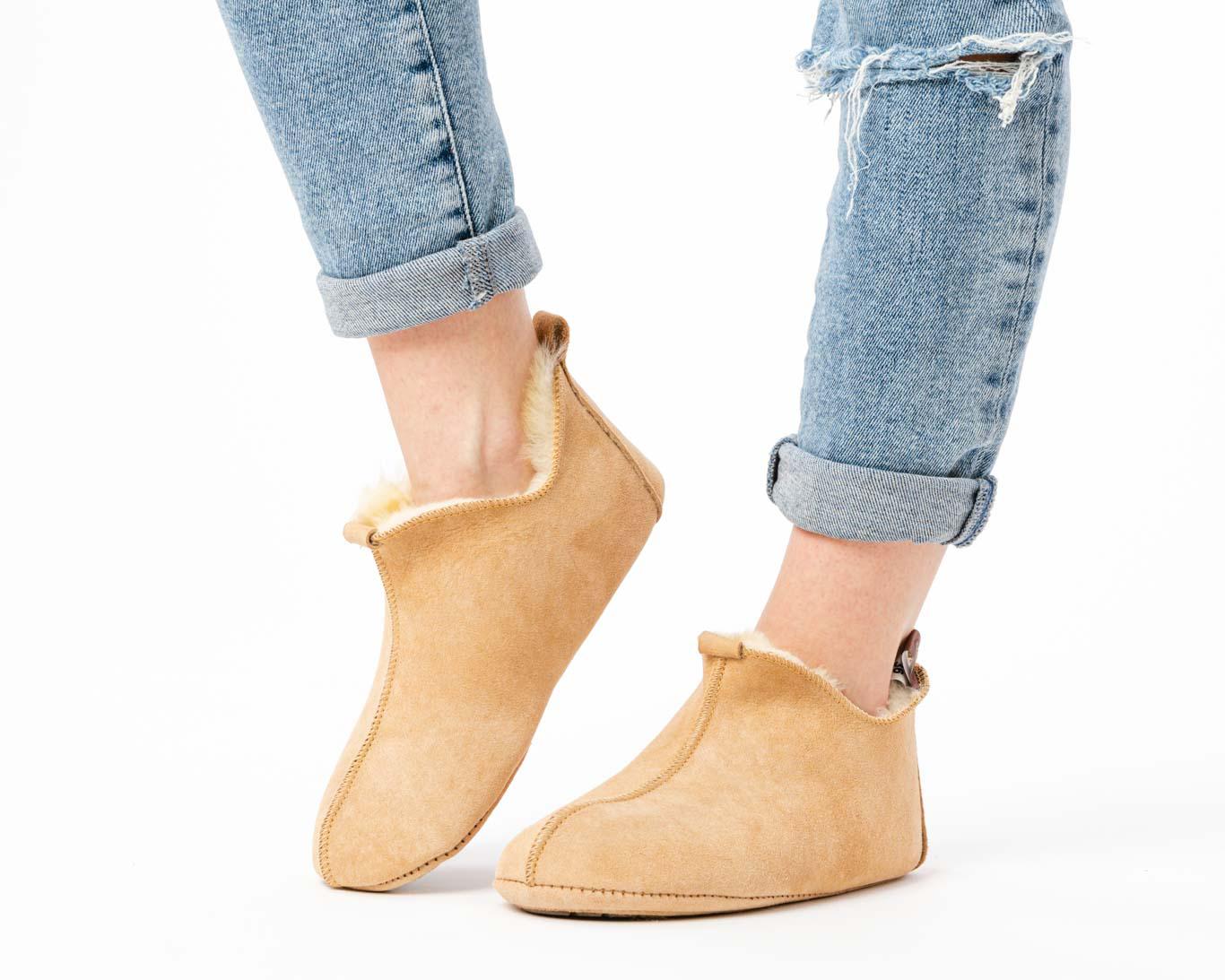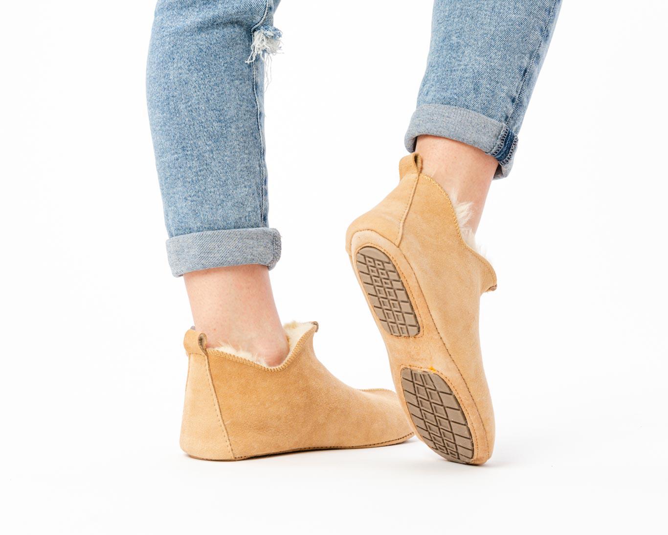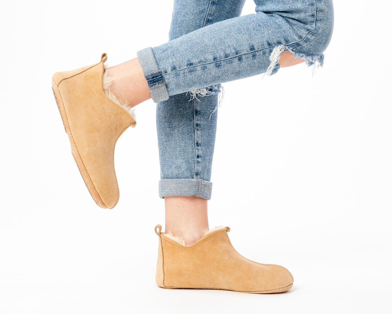 Damskie pantofle ze skóry owczej – beżowe kapcie skórzane