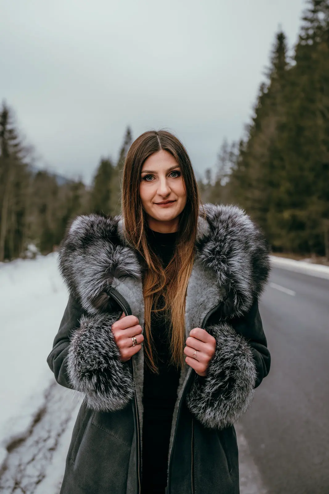 Wykończenie to naturalne futro lisa w kolorze szarościowym (srebrny lis) – gęste, puszyste i długie. Obszyte nim kołnierz, mankiety i dół płaszcza nadają całości szlachetną, niepowtarzalną oprawę. Każde futro jest nieco inne – odcień i struktura włosa mogą się nieznacznie różnić między egzemplarzami, co czyni każdą Kaskę prawdziwie unikatowym kawałkiem.