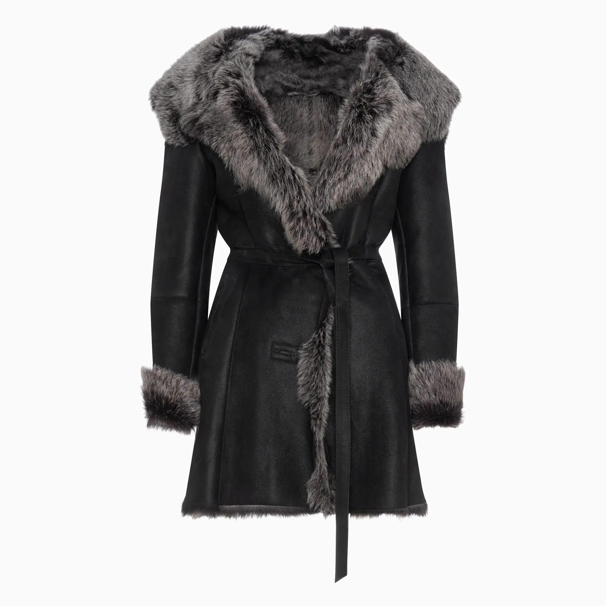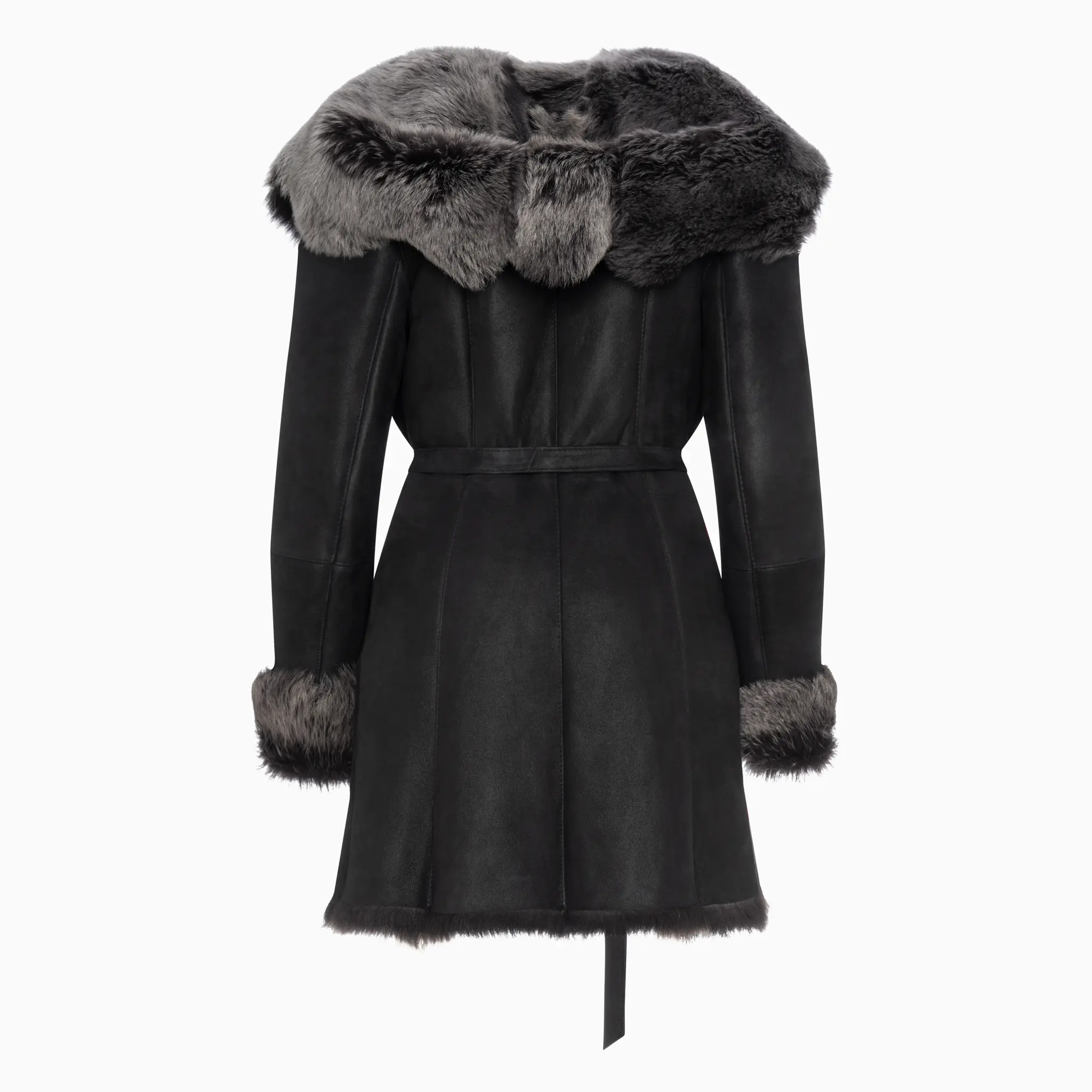 Szerokie mankiety z futra lisa to nie tylko estetyka – to praktyczna ochrona nadgarstków, gdzie wełna czy cienkie rękawiczki często nie wystarczają. Delikatne obszycie futrm na dole płaszcza zamyka całość spójną kompozycją. Każdy detal przemyślany, żaden przypadkowy.