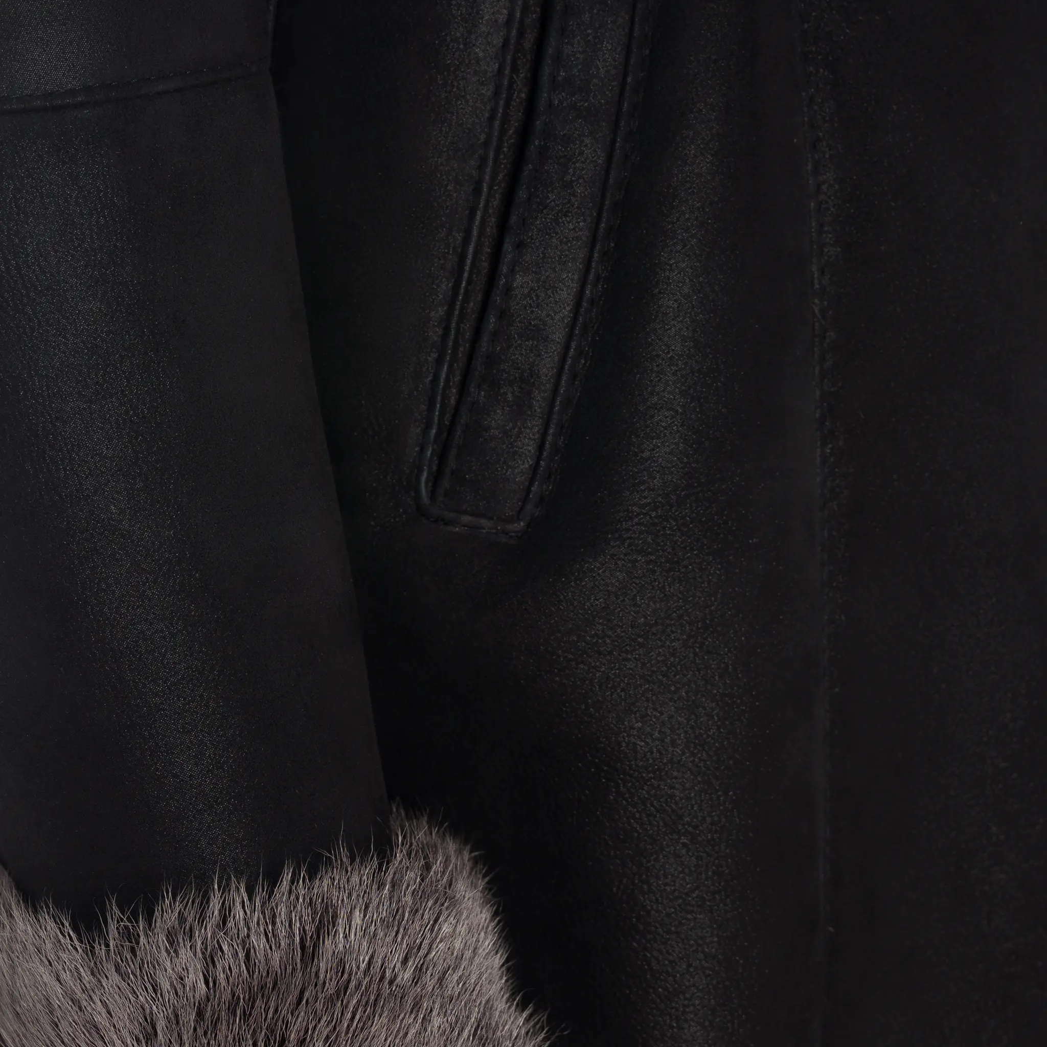 Są płaszcze, które po prostu przykuwają wzrok. Kaska 7/8 należy do tej kategorii – i doskonale zdaje sobie z tego sprawę. Czarna skóra jagnięca, szarościowe futro lisa w rozmiarze XL, skórzany pasek i długość 7/8, która wydłuża sylwetkę. To nie jest kożuch do niebycia zauważoną.