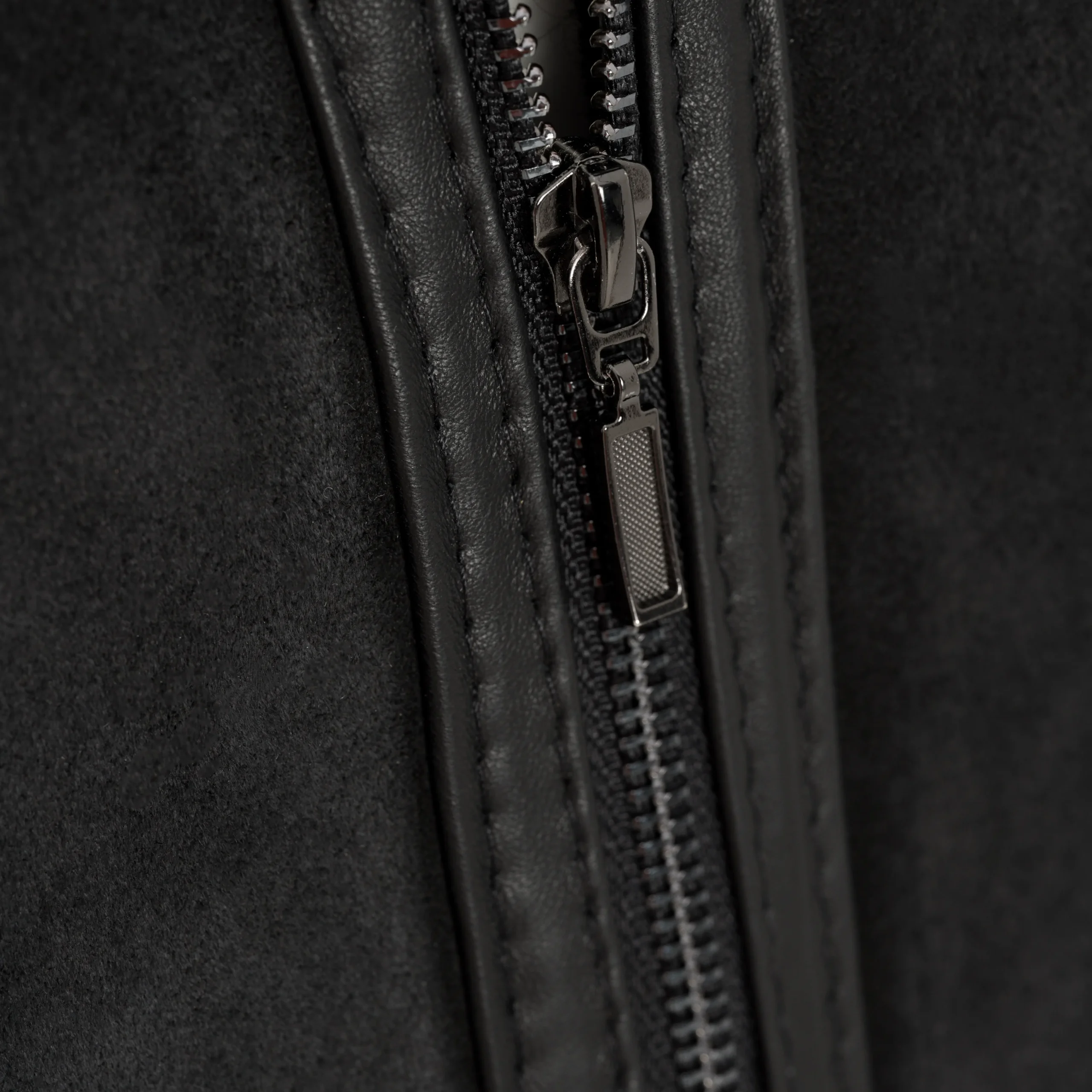 Zamiast plastikowego suwaka – masywny metalowy zamek w kolorze ciemnego srebra (gun metal) z szerokim ząbkowaniem i solidnym uchwytem. Widać to wyraźnie na zbliżeniu: to rodzaj zamka, który nie zawiesi się po trzecim sezonie. Krawędź zamka wykończona jest skórzaną listwą z przeszyciami – małe detale, które różnią produkt rzemieślniczy od masówki.