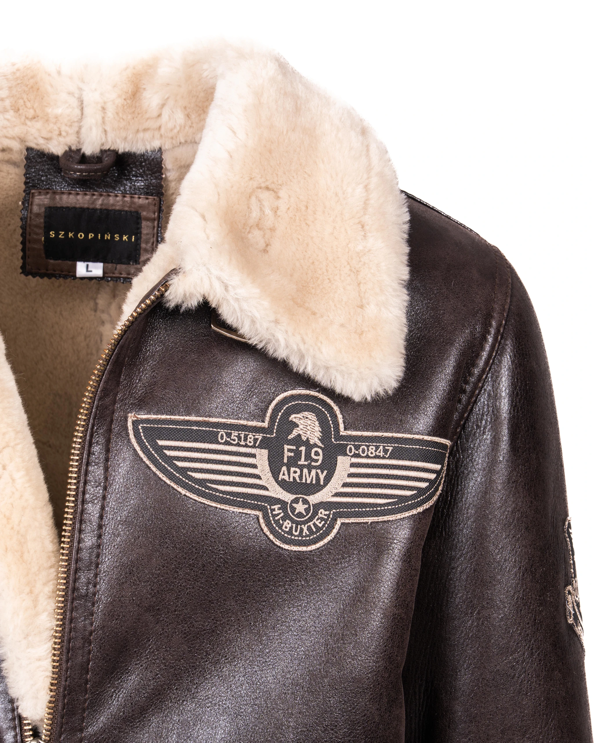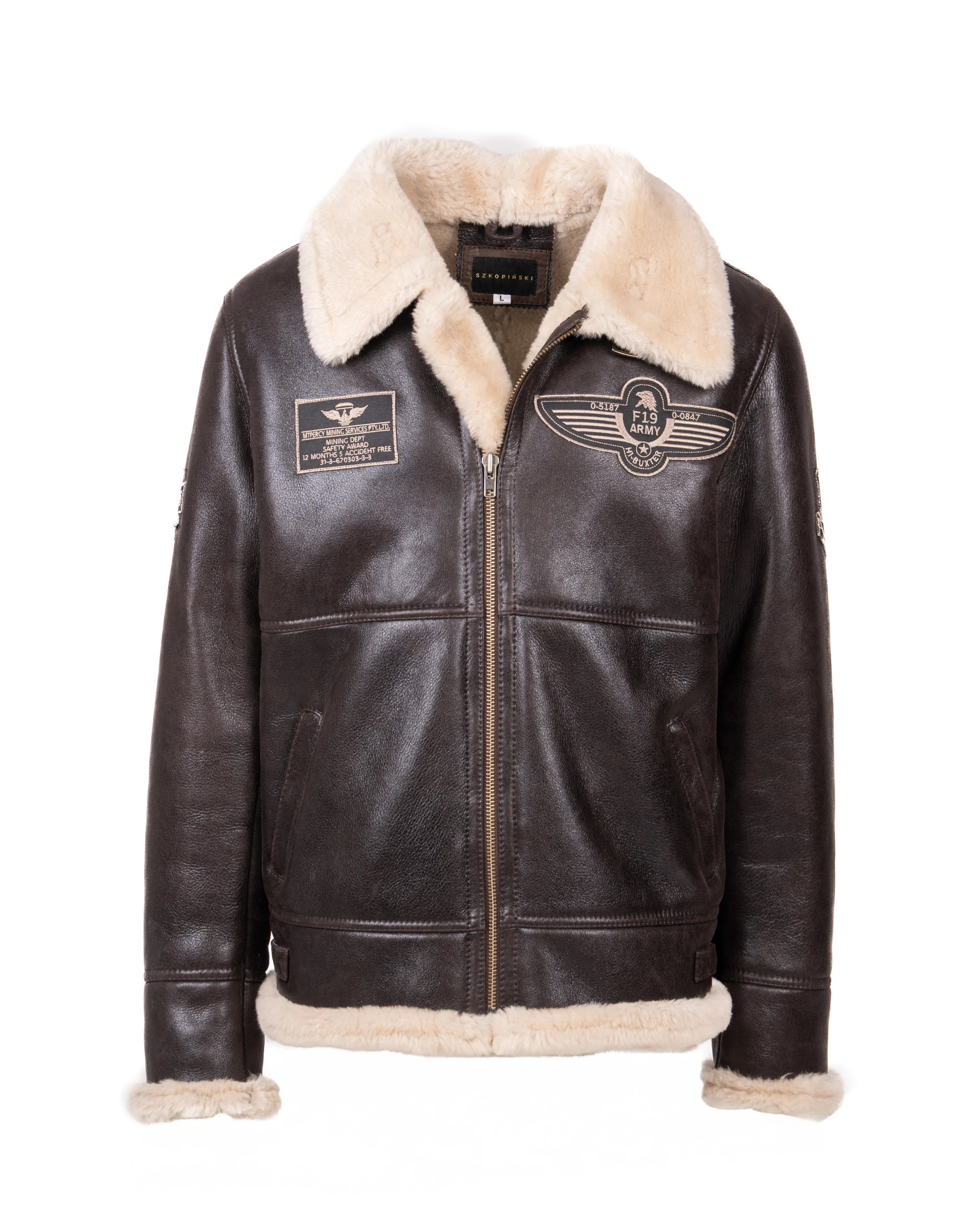 Wykonany z wysokiej jakości naturalnej skóry jagnięcej, kożuch wyróżnia się wyjątkową miękkością, trwałością i odpornością na zimowe warunki. Głęboki brązowy odcień skóry nadaje kurtce klasyczny charakter, a naszywki w stylu lotniczym podkreślają jej autentyczny klimat vintage.