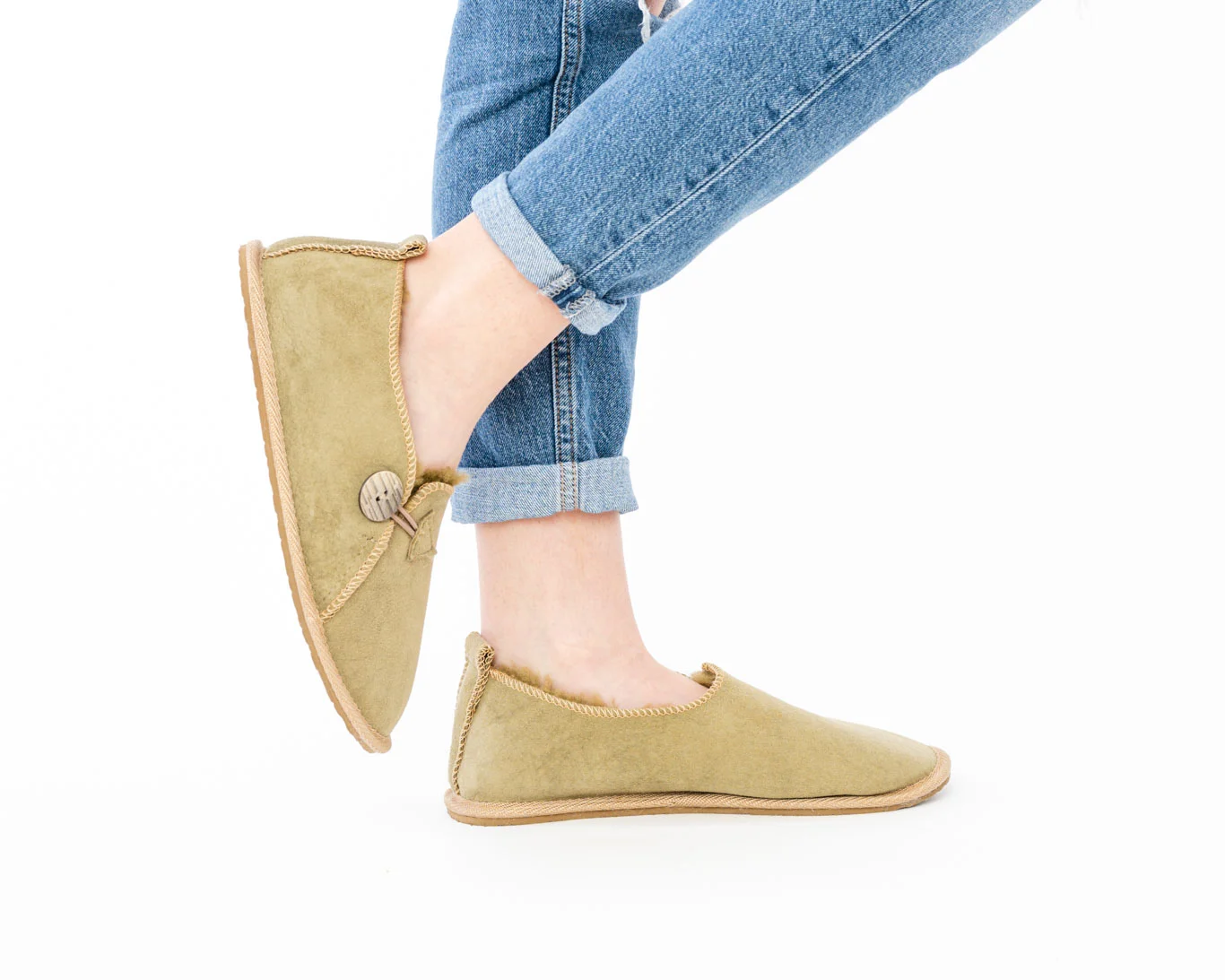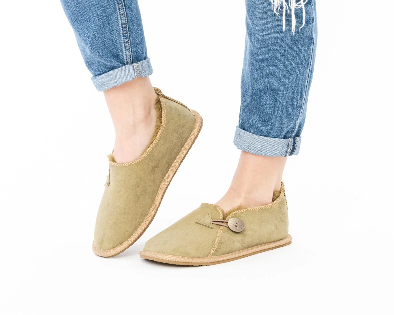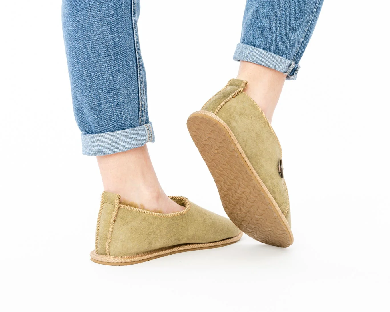 Ocieplane pantofle ze skóry owczej Hajduki – oliwkowe | ciepłe kapcie domowe na gumowej podeszwie